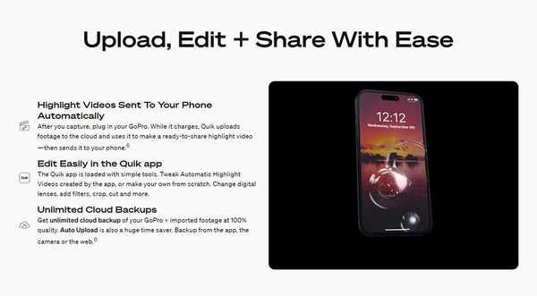 Tough, lightweight and easily mountable for hands-free recording, it’s ready for anything (on land or in the water) while advanced video stabilization keeps your footage smooth over rough terrain. After recording, simply plug in your GoPro. While it’s charging, your footage will automatically upload to the cloud and be sent to your phone as a highlight video that lets you relive your adventure and share the fun.