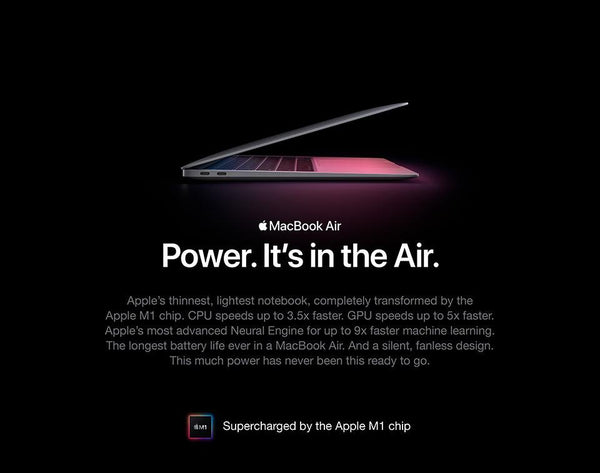 Our thinnest, lightest notebook, completely transformed by the Apple M1 chip. CPU speeds up to 3.5x faster. GPU speeds up to 5x faster. Our most advanced Neural Engine for up to 9x faster machine learning. The longest battery life ever in a MacBook Air. And a silent, fanless design. This much power has never been this ready to go.