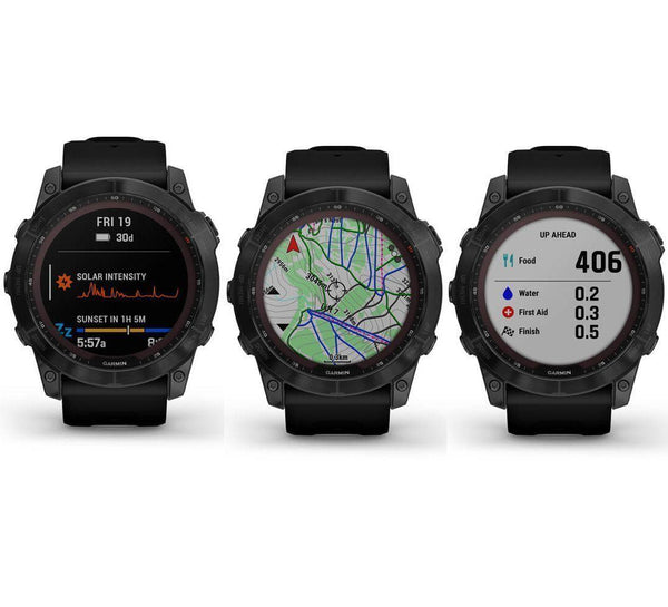 Meet any athletic or outdoor challenge with the rugged fēnix 7X Solar multisport GPS watch. Its Power Glass™ solar charging lens uses the sun’s energy to extend battery life — powering advanced training features, sports apps, health and wellness monitoring sensors and more.