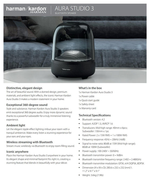 Style and substance. Harman Kardon Aura Studio 3 speakers emit exceptional 360 degree audio. Enjoy more dynamic sound thanks to a powerful subwoofer for a truly immersive listening experience.
