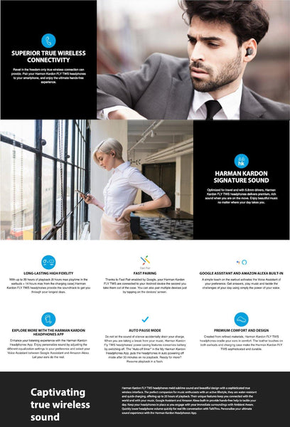 Captivating true wireless sound.Harman Kardon FLY TWS headphones meld sublime sound and beautiful design with a sophisticated true wireless interface. The perfect companion for music enthusiasts with an active lifestyle, they are water-resistant and quick-charging, offering 20 hours of playback. Their unique features keep you connected with the world and with your music. Google Assistant and Amazon Alexa built-in provide hands-free help to tackle your day. Keep your headphones in place as you engage with your immediate surroundings with Ambient Aware. Quickly lower headphone volume quickly for real life conversation with TalkThru. Personalize your ultimate sound experience with the Harman Kardon Headphones App.