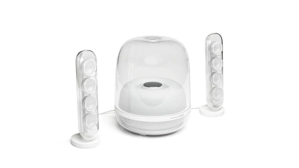 Harman Kardon SoundSticks 4 make a statement in any contemporary home. The groundbreaking transparent dome design and sleek silhouette blend in seamlessly with your decor. The two satellite speakers and subwoofer cover look stunning with an inner rippled surface design reflecting the beauty of music.