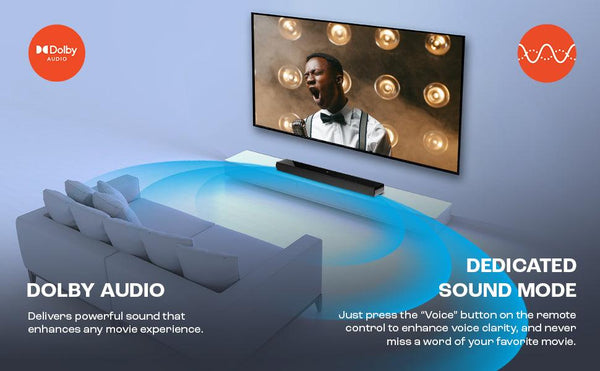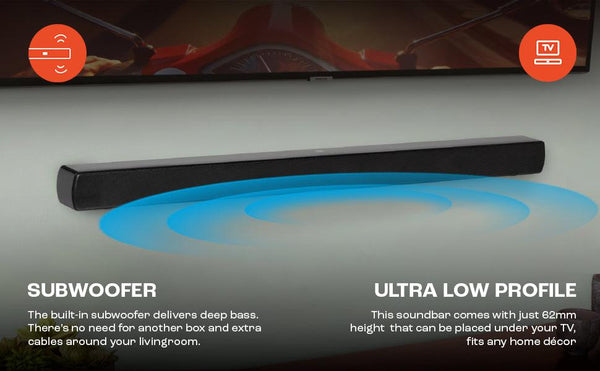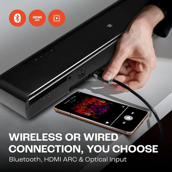The JBL Cinema SB120 is a hassle-free soundbar in low profile that fits neatly under your TV. It features Bluetooth for wireless music and one cable connection with HDMI ARC for a simplified user experience. Combining 110W of power, two full range drivers, two 2.5" woofers, a built-in subwoofer for deep bass and Dolby digital, it delivers powerful sound for the ultimate listening experience.