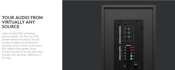 Logitech Z607 delivers true 5.1 surround sound. With 160 watts peak power on tap, this 5.1 speaker system wraps your space in high-quality audio that sounds amazing. Enjoy true surround sound from any source – your TV, phone, computer, games and more via RCA, 3.5 mm auxiliary jack and Bluetooth. You can even play audio content directly off USB drives and SD cards, and listen to FM radio. The 5.25 Inch subwoofer driver pumps out bass you can feel, while the included remote and 6.2-metre extra-long rear cables make it easy to set up and use.
