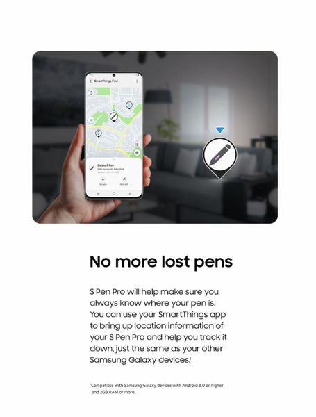 S Pen Pro will help make sure you always know where your pen is. You can use your SmartThings app to bring up location information of your S Pen Pro and help you track it down, just the same as your other Samsung Galaxy devices.