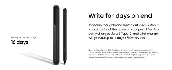 Jot down thoughts and sketch out ideas without worrying about the power in your pen. S Pen Pro easily charges via USB Type C, and a quick 50 minute plug in will get you up to 16 days of battery life.