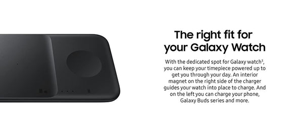With the dedicated spot for Galaxy watches, you can keep your timepiece powered up to get you through your day. An interior magnet on the right side of the charger guides your watch into place to charge. And on the left you can charge your phone, Galaxy Buds series, and more.