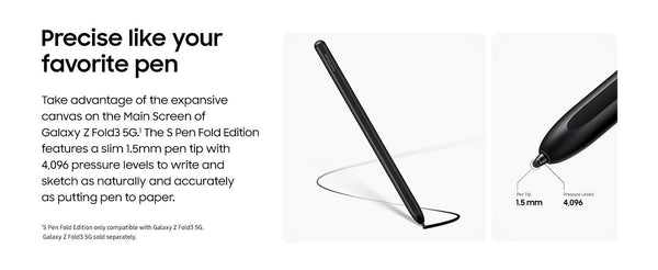 Take advantage of the expansive canvas on Galaxy Z Fold3 5G's Main Screen. The S Pen Fold Edition features a slim 1.5mm pen tip with 4096 pressure levels to write and sketch as naturally and accurately as putting pen to paper.