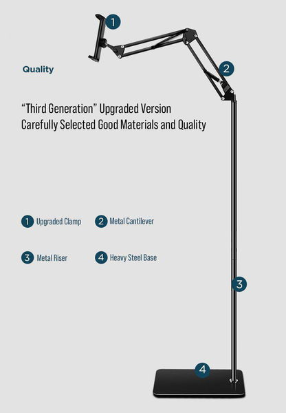 The Universal Adjustable Mobile Tablet Floor Stand Holder is the yin, to your yang. You've found what you're looking for.