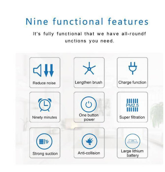 - Function: One-button start, sweeping, mopping, vacuum cleaner, USB charging, universal driving, automatic avoidance obstacles, anti-drop, low noise, intimate, low repetition, high coverage