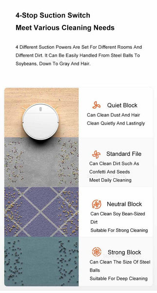 Features: Sweeping + Mopping, multifunctional vacuum cleaner 2200Pa strong motor supports 4 gears adjustable suction power A 200ml water tank that supports three gears adjustment 3 layers filtration system prevents the second pollution 82mm tall, clean the dust under the bed or sofa. Support route planning clean Mijia APP remote control, check clean situation at any time. 17mm obstacle-crossing ability Break-point continue to sweep Smart automatic self-recharging